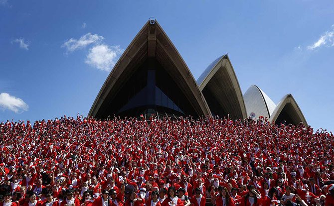 Бегуны в костюмах Санта-Клаусов перед Сиднейским оперным театром, 7 декабря 2014. Мероприятие проводится каждый год с целью сбора средств для оказания помощи детям из неблагополучных семей.
