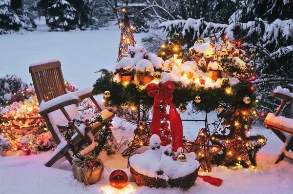 Зимний сад, укутанный снегом и залитый светом гирлянд, — отличная декорация для встречи Нового года.