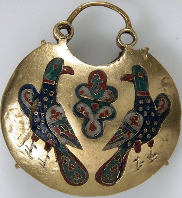 Необходимым дополнением в качестве украшения были драгоценные пуговицы, пряжки, булавки и, конечно же, золотые и серебряные цепи, которые чаще собирались из плоских элементов или из завитков плющеной скани и украшались белой или голубой эмалью.