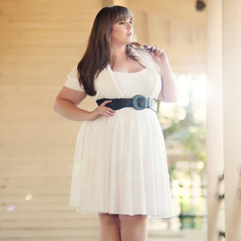 На фото – очень полная девушка в белом нарядном платье. Ее фигура называется “яблоко”. Обратите внимание на фасон ее платья и вспомогательный аксессуар – черный пояс. Пояс обладает удивительным свойством – делать талию там, где ее никогда не было (в данном случае, прямо под грудью). И, тем не менее, платье с завышенной талией даже “полнящего” белого цвета в сочетании с туфлями-лодочками на высоком каблуке делают из этой, прямо скажем, толстой девушки настоящую красавицу, которая уверена в себе и в своей привлекательности: