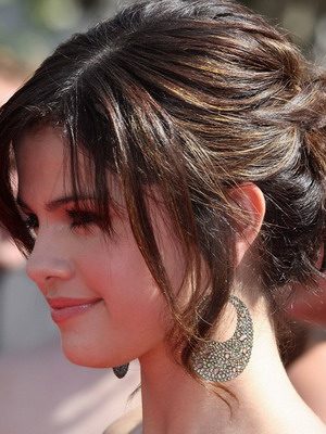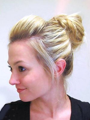 Как видно на фото, пучок на средние волосы получится очень романтичным, если на висках выпустить несколько прядей: