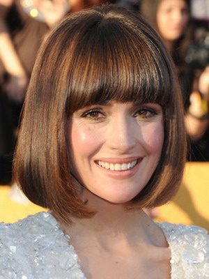 Красиво обрамляет лицо удлиненная челка с прямым краем. Она прикрывает брови и делает контур лица четким.