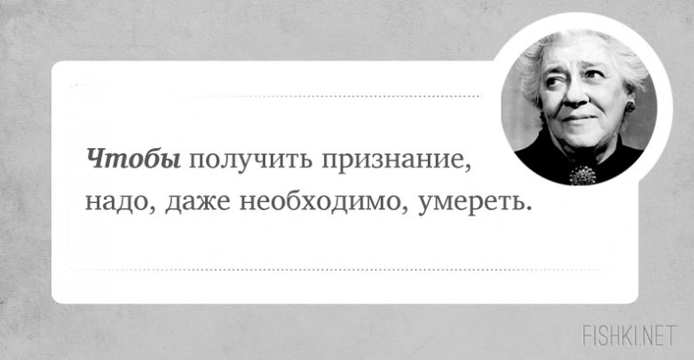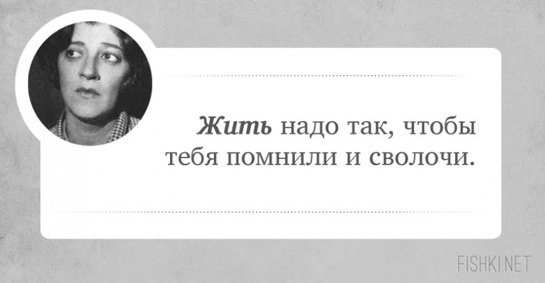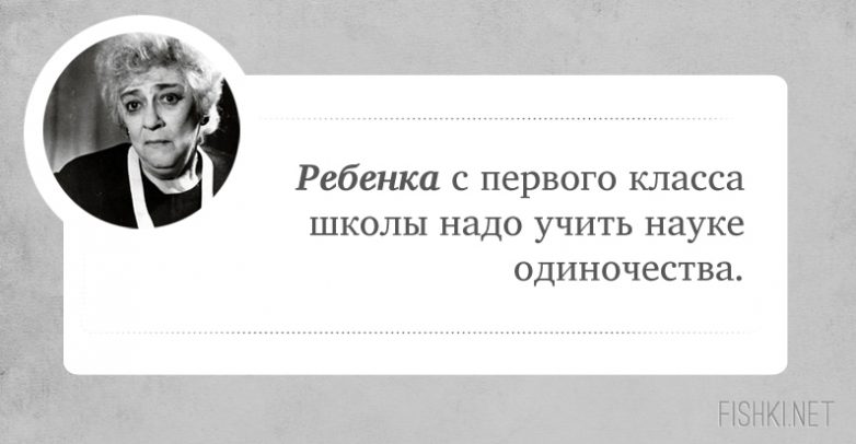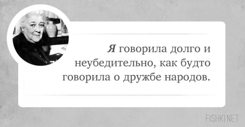 Фаина Георгиевна — ГЕНИЙ на все времена! Второй такой не будет, как и не будет второй Пугачёвой, второго Высоцкого и пр. ЛИЧНОСТЬ. И главное: её высказывания — не «приколы». Она говорила то, что думала.