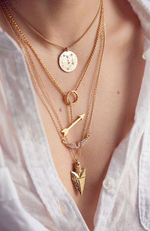 И, наконец, о цепочках с подвесками, которые также можно надевать в несколько рядов, хотя сама эта мысль поначалу кажется абсурдной. Для сочетания нескольких подвесок на шее самое важное — это надевать их на тоненькие цепочки так, чтобы всё внимание приковывалось именно к кулонам. Подвески, расположенные ближе к шее, должны быть самыми миниатюрными и лёгкими. Между рядами цепочек нужно оставлять достаточно места, чтобы свободно разместился каждый кулон — это достигается разницей в длине цепочек.