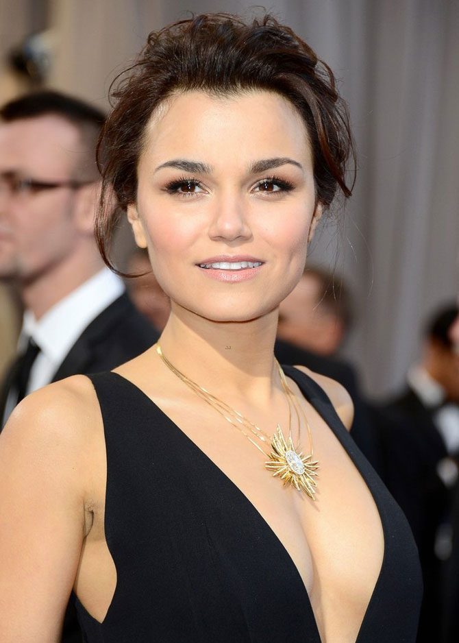 Anne Hathaway в длинном кулоне на платье с вырезом-лодочкой
