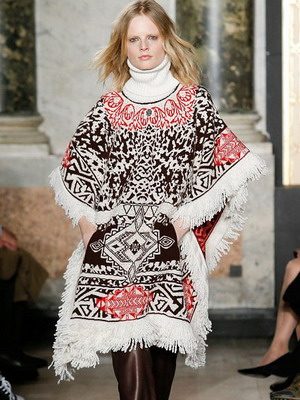 Активный принт и отделка модели позволяют создать изысканный богемный образ. Этнические, психоделические и классические геометрические объемные принты – такие пончо на зиму 2015 года представил модный Дом Emilio Pucci. Классический кашемир и вязаный шерстяной трикотаж насыщенных тонов бордово-оранжевой гаммы.