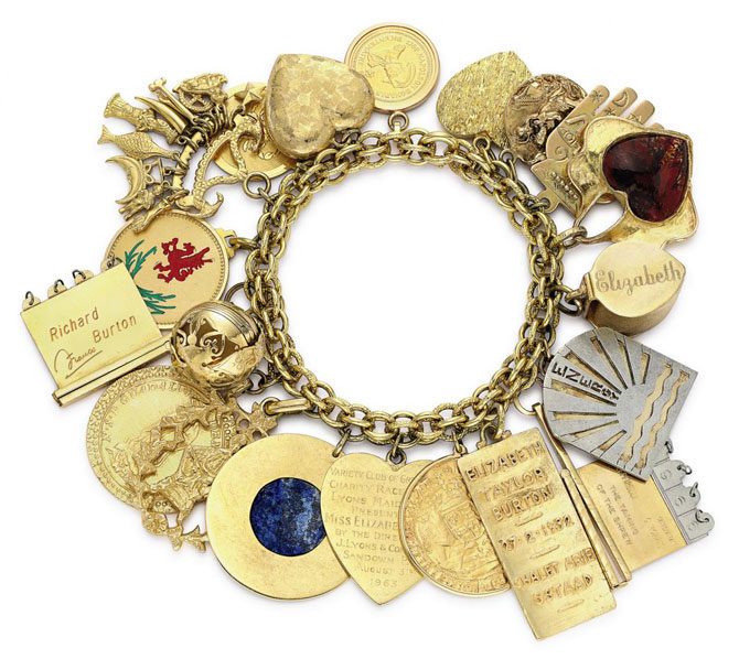 С юношеских лет Элизабет Тейлор увлекалась коллекционированием украшений с брелоками, рассказывающими о каких-либо памятных событиях в ее жизни. На данном золотом браслете можно увидеть брелок в виде кинохлопушки в память о фильме «Укрощение строптивой», а также сферу с четырьмя медальонами внутри, на которых написаны имена и даты рождения её детей