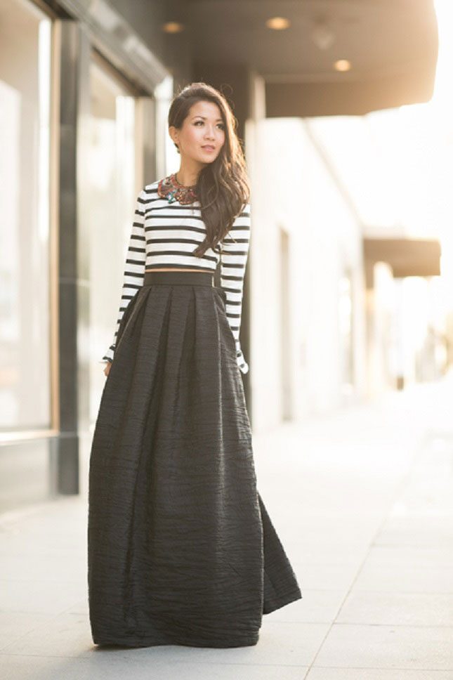 Чёрная макси-юбка из плотного материала и так годится на звание «мечта этой весны», а тут ещё стильный кроп-топ с длинным рукавом…ох. Силуэт получается потрясающим.
