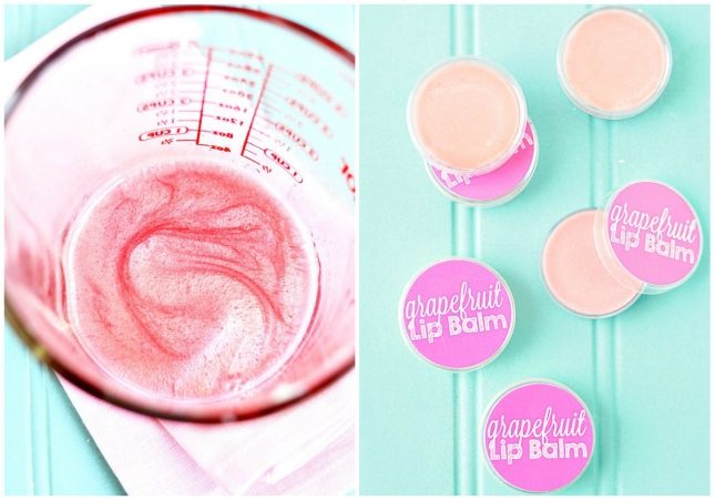 Пчелиный воск, масло ши, кокосовое и миндальное масло в одинаковых количествах (по одной столовой ложки для начала, к примеру) + 15 капель грейпфрутового масла\сока и съедобная пудра для блеска. Настоящее удовольствие для губ, которое еще и красиво смотрится.