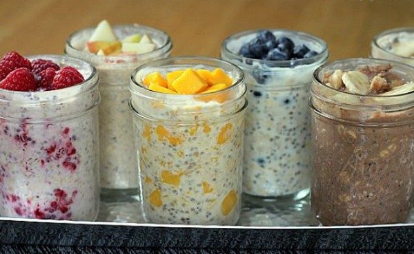 Закрываем банку крышкой и ставим на ночь в холодильник. Утром овсянка мягкая и вкусная — готова. На разгрузочный день вам нужно таких 2 банки. Для обычного завтрака такие овсяные завтраки готовятся с медом или сахаром. Для разгрузочного дня — конечно без меда и без сахара.