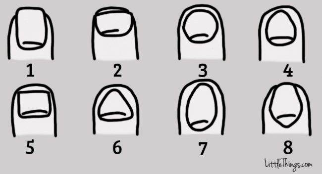 Все просто. Посмотрите на свои ногти и попробуйте определить их форму — вам поможет картинка ниже. Если вы не можете найти свой «тип», выберите тот, который похож больше всего.