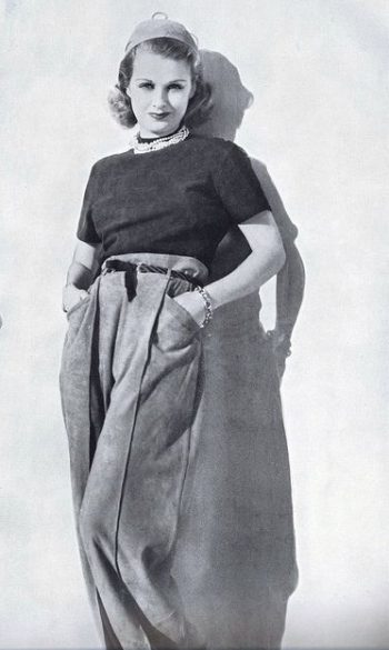 Кроме платьев и юбок, девушки и женщины 40-х с удовольствием носят брюки. Крой свободный, линия талии немного завышена, см. фото: