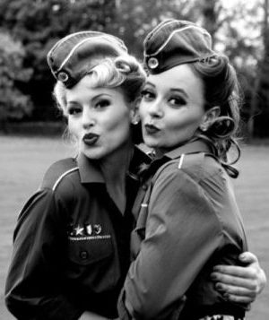 Мода 40-х годов не могла не подвергнуться значительному влиянию Второй Мировой войны; девушки и женщины примеряют на себя военную форму. Стиль милитари бьёт все рекорды популярности и… выглядят не менее женственно, чем всегда.