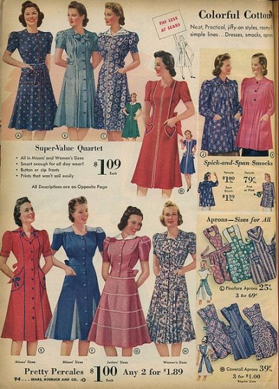 На фото — вырезка из модного журнала американского Vogue. Платьев 40-х годов — приталенные и цельнокроенные; в моде А-силуэт.