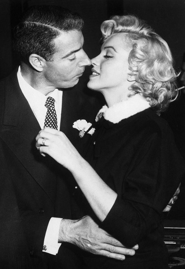 3. Мэрилин Монро (Marilyn Monroe) для своей свадьбы с бейсболистом Джо Ди Маджо тоже предпочла темную цветовую гамму: на бракосочетание в Сити-холл в Сан-Франциско она приехала в черном шерстяном с костюме с белым меховым воротничком.