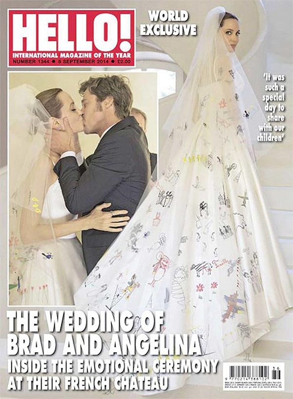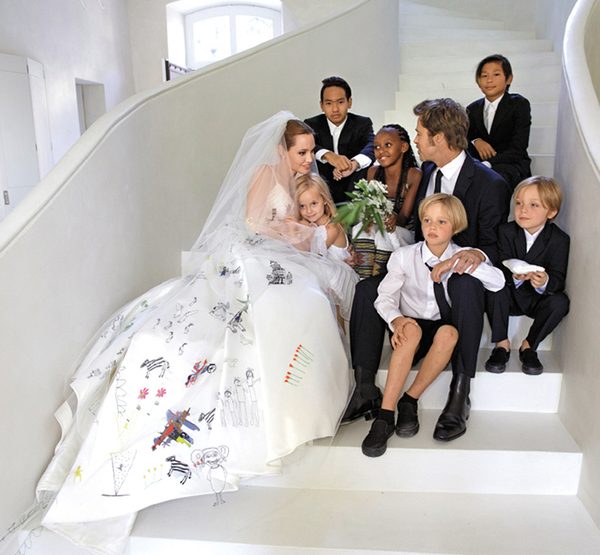 10. Анджелина Джоли (Angelina Jolie) вышла замуж за Брэда Питта (Brad Pitt) в платье Atelier Versace с вышитыми вручную рисунками ее детей.