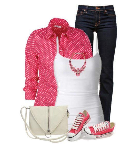 Женские кеды конверсы с джинсами – это, пожалуй, самый распространенный вариант повседневного гардероба. Здесь практически не существует никаких правил. Джинсы могут быть разных цветов, длинные или укороченные, но обязательно зауженные книзу. Особую популярность обрели объемные рваные джинсы «бойфренды» со спортивной обувью. Ослабив на них шнуровку, можно усилить небрежность образа. Клетчатые рубашки или футболки свободного кроя завершат уличный образ. Однако обладательницам невысокого роста следует избегать сочетания длинных кед с укороченными джинсами – это визуально сделает их рост еще меньше.