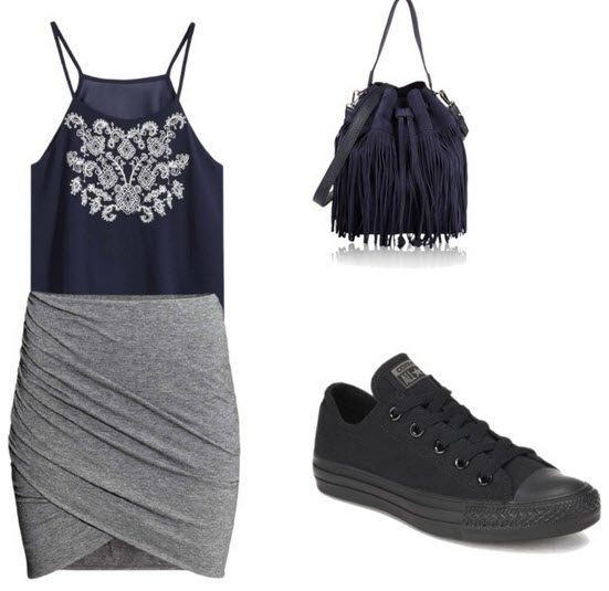 Сочетание женских кед конверсов с платьем вошло в моду не так давно, но моментально стало одним из самых популярных на городских улицах. В таком виде можно выйти на прогулку или посетить вечеринку. При этом в крое платья желательно избегать жестких форм и лишних деталей. Чем проще будет образ, тем сложнее будет с ним ошибиться и выглядеть глупо. Платье может иметь однотонный нейтральный цвет, тогда весь акцент удачно сместится на обувь.