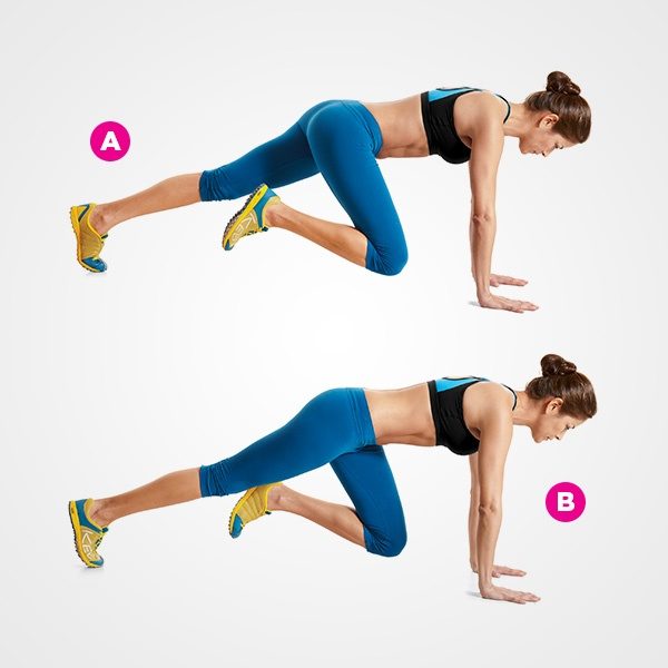 Комплексное упражнение, которое укрепит ваш пресс и поможет сжечь калории. Исходное положение такое же, как при отжиманиях. Напрягите пресс, поднимите правую ногу и медленно подтяните ее к груди. Следите за положением спины и бедер: они должны быть зафиксированы. Вернитесь в исходное положение и сделайте то же самое левой ногой.