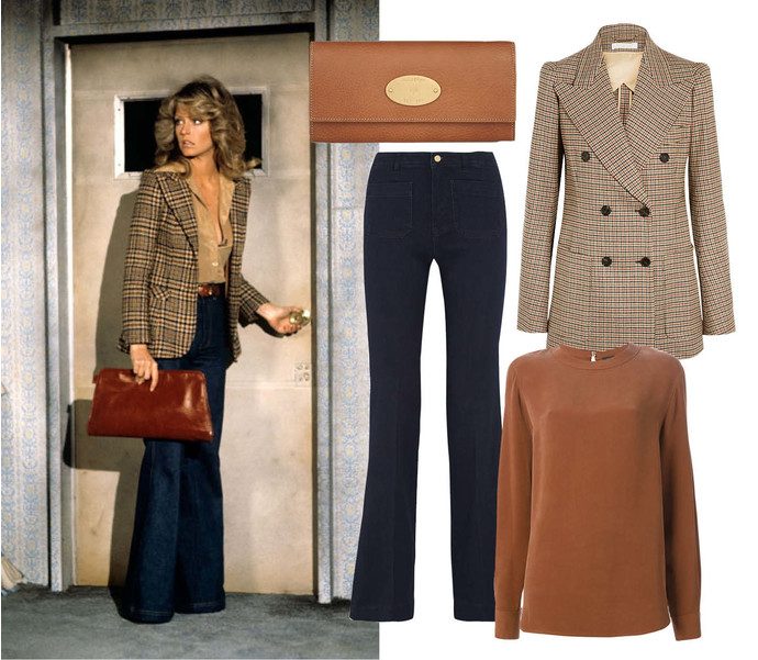 Шелковые блузы, заправленные в стильно расклешенные джинсы, и клетчатый блейзер в мужском стиле — фирменный силуэт актрисы Фэрры Фосетт в 1970-х определил моду целого поколения. Образ обычно завершала знаменитая многоуровневая укладка Фэрры, ставшая именем нарицательным в парикмахерском деле. Она же закрепила за «Ангелом Чарли» оригинального состава статус главной модницы своего времени.