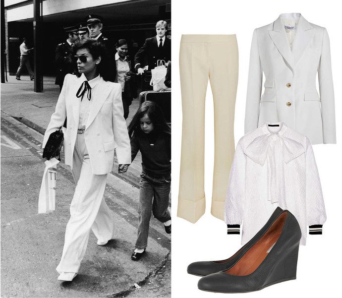 Известная правозащитница и актриса Бьянка Джаггер внесла свою лепту в модную историю, выбрав белоснежный брючный костюм для свадьбы с лидером группы The Rolling Stones Миком Джаггером в 1971 году. Модель и муза многих дизайнеров, брюнетка особенно любила носить вещи в стиле унисекс, ставшие изюминкой ее стиля.