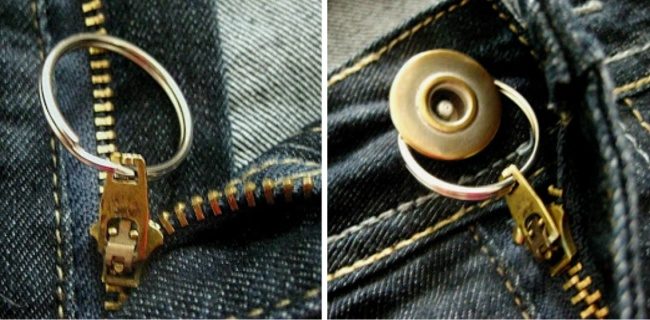Проденьте кольцо от брелка в брелок бегунка. Зацепите за пуговицу.