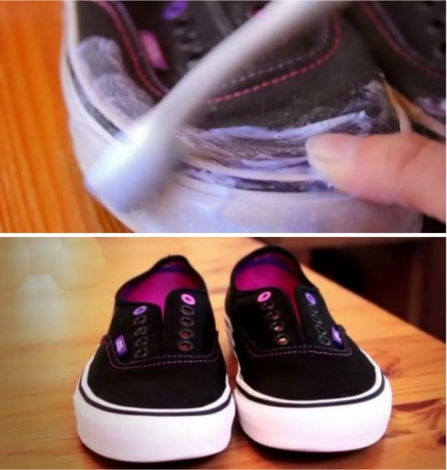 Смешайте моющее средство и соду в миске. Возьмите использованную зубную щетку и проведите генеральную чистку белой окантовки кед.