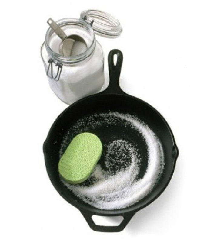 Лучший способ очистить чугунную сковороду — сделать это с помощью соли. Соль впитает масло и поможет удалить кусочки пригоревшей еды. После этого останется сполоснуть её и вытереть насухо.