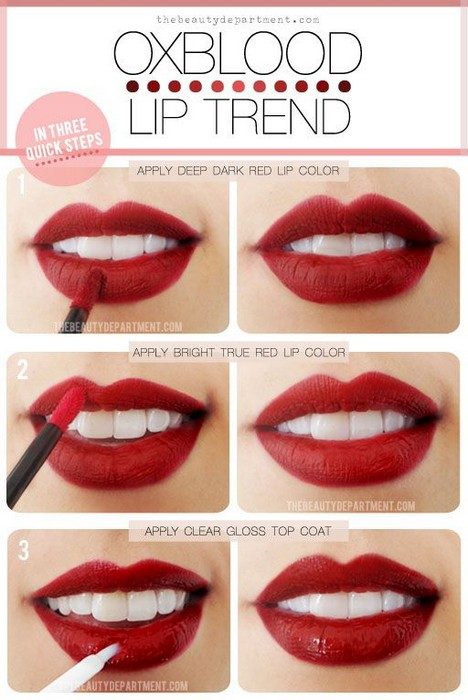 Красная помада не зря считается классикой. Этот цвет акцентирует губы на фоне лица и визуально делает их больше. Для усиления эффекта можно использовать приём, так любимый визажистами: полностью закрасить губы актуальным тёмно-алым оттенком; сверху, на выступающие участки (центр верхней и нижней губы) нанести «классический» ярко-красный, а топом – прозрачный блеск. Сочетание более тёмного и более светлого нюансов одного цвета, а также влажный «блик» создадут иллюзию объёмных губ. При этом мало кто догадается, что это чуть больше, чем обычная красная помада.
