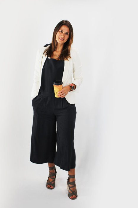 Черный комбинезон и белый пиджак — наряд, подобранный мужем Анны в первый день рабочей недели.