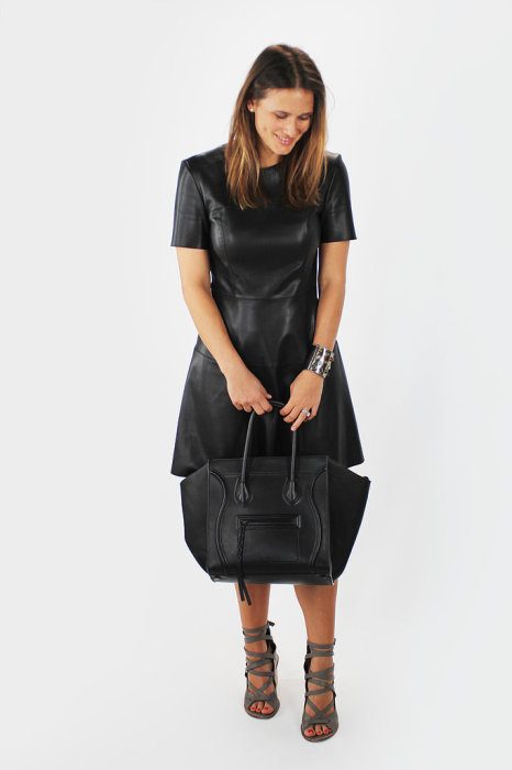 В четверг Томас выбрал для Анны черное кожаное платье и серые босоножки на каблуках. Из аксессуаров были сумка Celine и массивный металлический браслет, который прекрасно завершал образ.