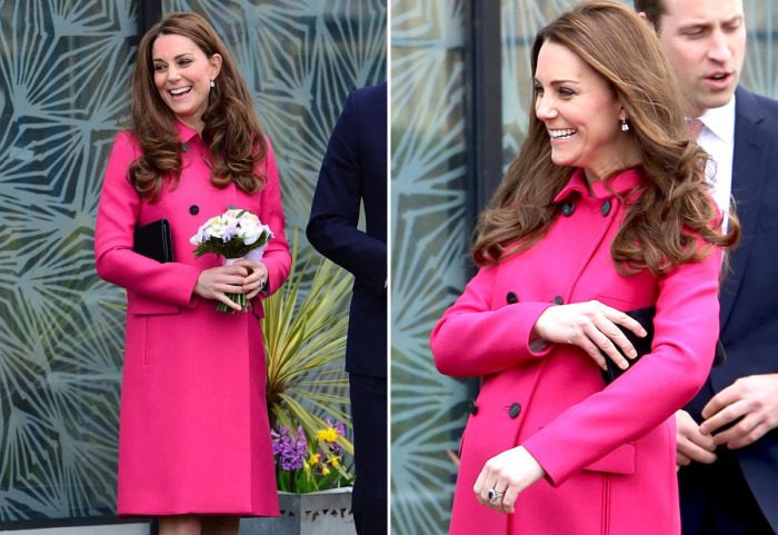 Кейт Миддлтон в ярко-розовом пальто от известного английского бренда «Mulberry».