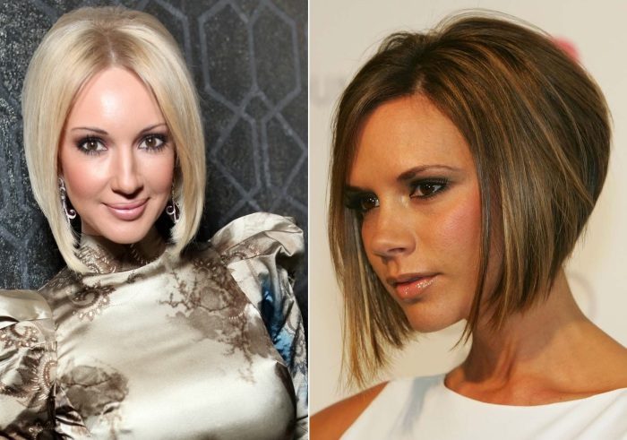 Российская телеведущая и актриса Лера Кудрявцева и британская певица и модный дизайнер Виктория Бекхэм с удлиненным боб-каре.