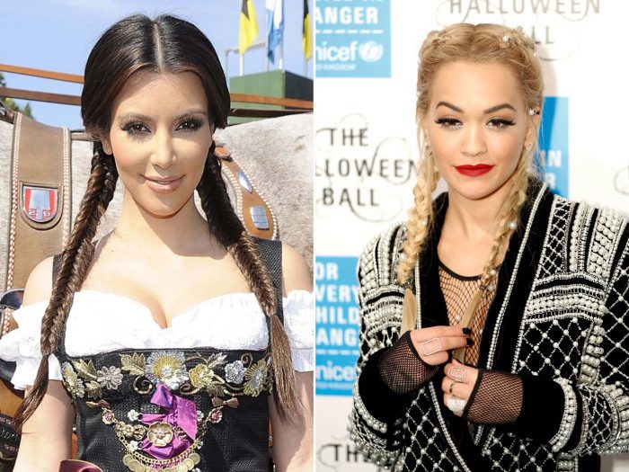 Американская фотомодель Ким Кардашян и британская певица Рита Ора с двумя косичками.