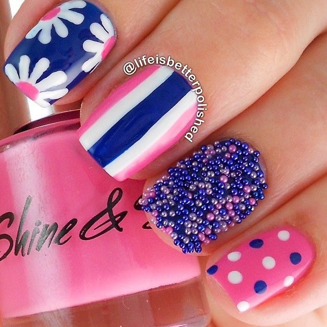 Девушки, скорее всего, выберут карамельно-розовый, великолепно сочетаемый с золотом, белым и черным цветами. Мотивы могут быть разнообразными: полоска по диагонали, ромашки, пики, божья коровка и так далее. «Икорный» дизайн на розовом фоне, выполненный на одном или двух ногтях, привлечет внимание. По фэн-шуй принято выделять ноготь на безымянном пальце.В домашних условиях в сочетании с розовым маникюром можно использовать дизайн фольгой на безымянном пальце, украсить основание ногтя камешками, нарисовать точку и обсыпать ее блестками. Помимо уже названных оттенков розового стильно смотрятся пудровый и розовый с тонами морковного. Помните, что в топе маникюр как способ самовыражения!