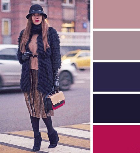 Прекрасно, если у вас найдётся меховое пальто тёмно-синего или чёрного цвета. Носите его с тёмно-бежевой длинной юбкой или прямыми деловыми брюками, светло-бежевой трикотажной кофточкой, не забудьте о деталях – шарфе или сумке с розовым принтом. В качестве обуви используйте чёрные ботильоны или сапоги.