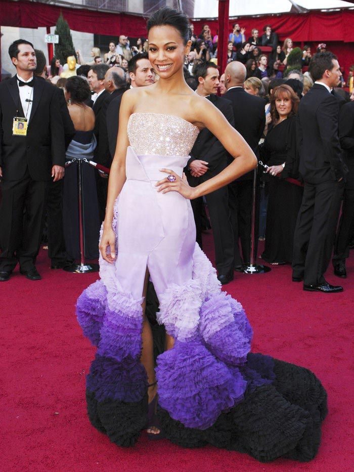 Наряд Зои, выбранный для «Оскара"-2010, судя по всему, был экспериментальным вариантом платья для главной кинопремии, но в итоге оказался одним из фаворитов модных критиков: стилист звезды не ошибся ни с цветовой гаммой (разнообразные оттенки очень красиво сочетались со смуглой кожей актрисы), ни с нестандартным кроем.