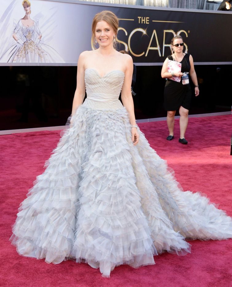 Эми Адамс, номинированная в 2013 году в категории «Лучшая женская роль второго плана» за фильм «Мастер», выбрала для церемонии жемчужное платье с пышной юбкой от Oscar de la Renta. Актриса плыла по красной дорожке, словно лебедь, а за нею постоянно следовали два ассистента – чтобы расправлять во время фотографирования длинный шлейф наряда.
