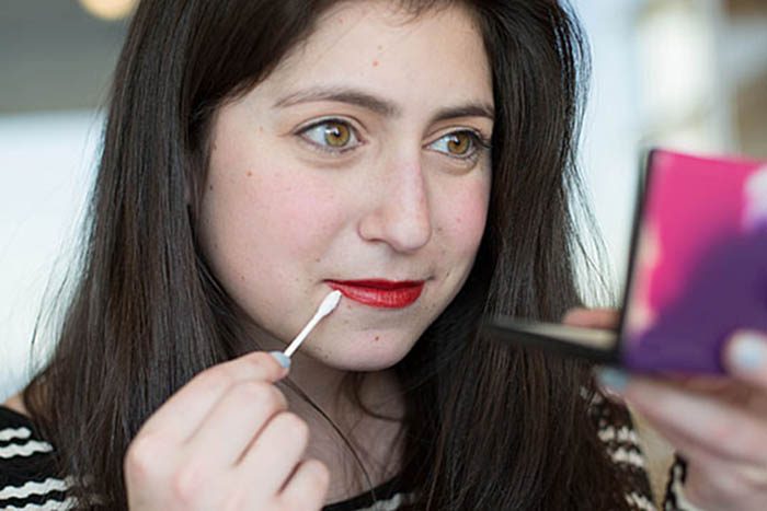 Ужасный вид, когда помада нанесена на губы неаккуратно, не по контуру. Выровнять его поможет ватная палочка и прозрачная пудра, которая не даст помаде за целый день растечься вокруг губ.