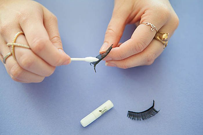 Чтобы аккуратно нанести клей для наклеивания искусственных ресниц, понадобится ватная палочка. Обмакиваем её кончик в клей и наносим его на край для приклеивания так, чтобы он не попал на ресницы. Ждём несколько секунд и приклеивайте ресницы к веку, так, чтобы выглядели они натурально.