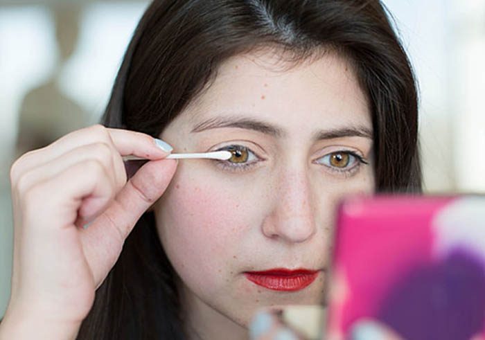 Смачиваем кончик ватной палочки средством для снятия макияжа и убираем тени с век. Затем переворачиваем палочку и чистым сухим концом вытираем на веке средство для снятия макияжа. 13. Боремся с мешками под глазами