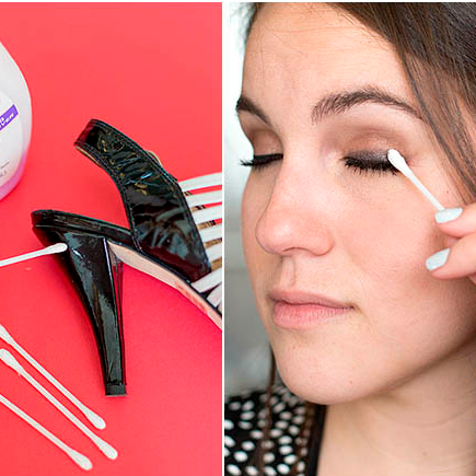 Если на лаковых босоножках появилась царапина, то на это место с помощью ватной палочки круговыми движениями нужно нанести жидкость для снятия лака для ногтей. Так удастся замаскировать место повреждения.10. Убираем лак с кожи вокруг ногтей