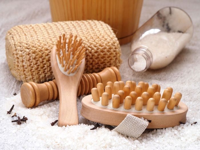 Сухой массаж делается при помощи специальных деревянных щёток. Делать его рекомендуется каждый день после принятия душа. На эту процедуру уходит не более пяти минут, но результат заметен уже через неделю, после применения этой технологии. Такой массаж стимулирует кровообращение и способствует уменьшению жиров.