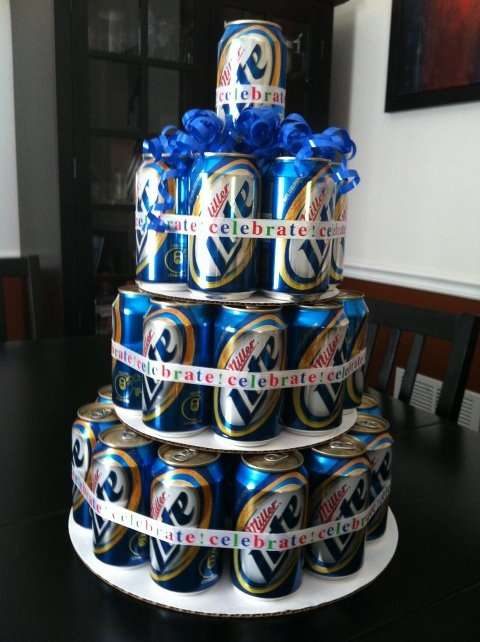 Для изготовления такого торта из пива, вам понадобится упаковка из 30 баночек пива и три картонных круга диаметром 30, 25 и 20 см. Просто поместите баночки пива на картонные круги в форме торта и перевяжите ленточкой.