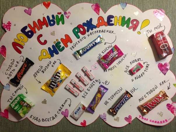 Используйте свое воображение, чтобы заменить некоторые слова на названия конфет и шоколадок. Лучше всего заранее написать на черновике планируемое поздравление, а затем перенести его на плакат, закрепив сладости вместо слов с помощью скотча.