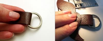 Проденьте полоску из кожи через кольцо и сложите. Соедините концы. Между полоской поместите деталь усов и прострочите на расстоянии 2-3 мм от края.