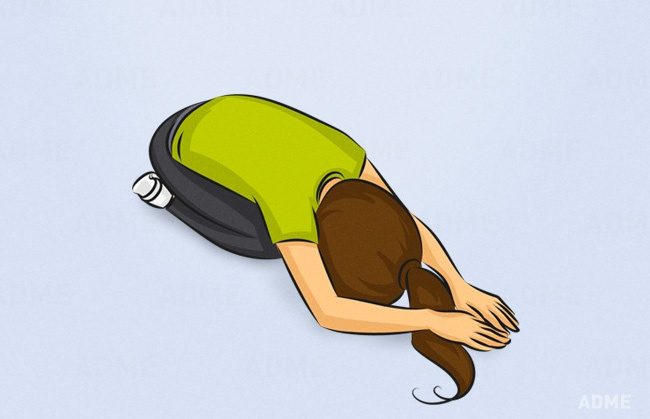 Как выполнять. Ноги под собой, колени вместе. Опускаемся вперед и максимально округляем спину. Руки обхватывают колени или вытянуты вперед.
