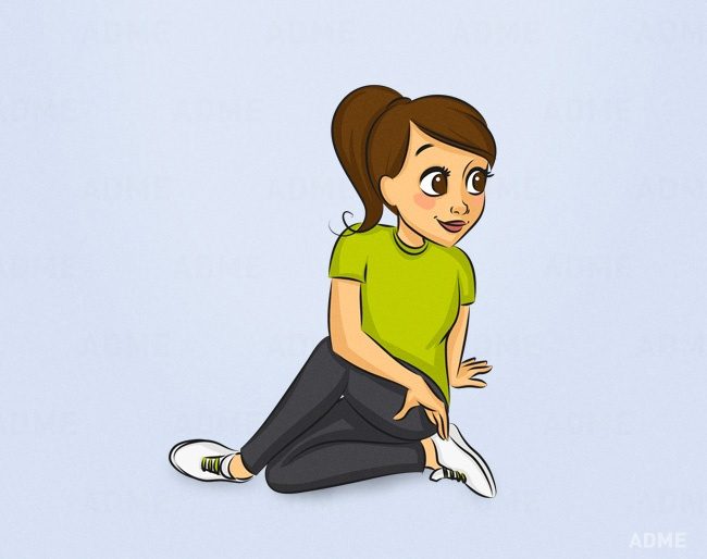 Как выполнять. Садимся на пол, одну ногу выставляем вперед, вторую прижимаем к бедру. Корпус разворачиваем в противоположную сторону, одной рукой упираемся в пол, другой — в колено. Повторяем в другую сторону. Голова повернута и направлена в противоположную от скручивания сторону, тем самым усиливая его эффект.