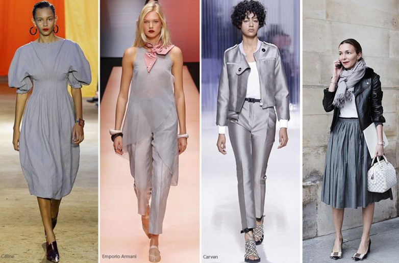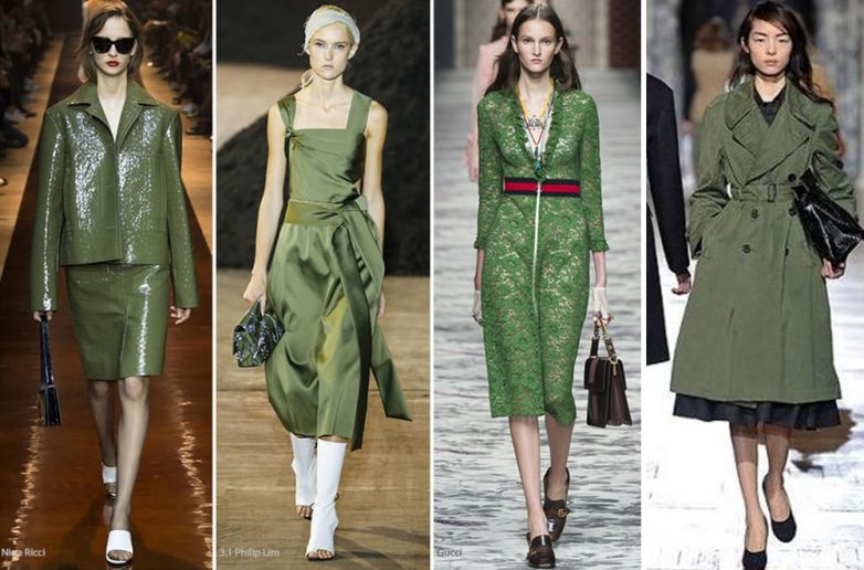 Стилисты словно смешивают зеленый и серый. Цвет завораживает, как глубина морского дна. Его можно носить обособленно, без дополнений, а можно сочетать и дополнять яркими акцентами, например, с желтым.