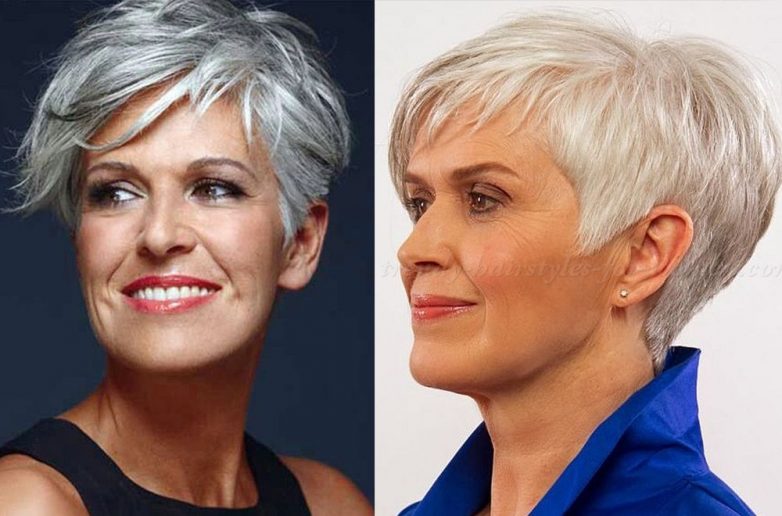 Если женщина предпочитает остаться в родном цвете – прелестно! Иногда модная пикси на седых волосах смотрится лучше, чем на волосах юных экспериментаторш. Это касается коротких стрижек с длинными боковыми челками, которые красиво ложатся по диагонали в стиле французского шика.